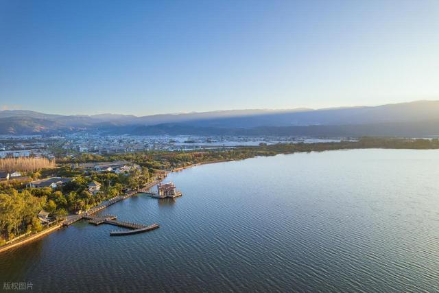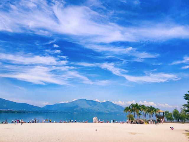 金鳞沙滩眺望广阔的邛海,天气晴好时,湖面是淡淡的蓝色,日落时分,水面泛着金光。